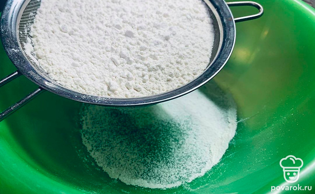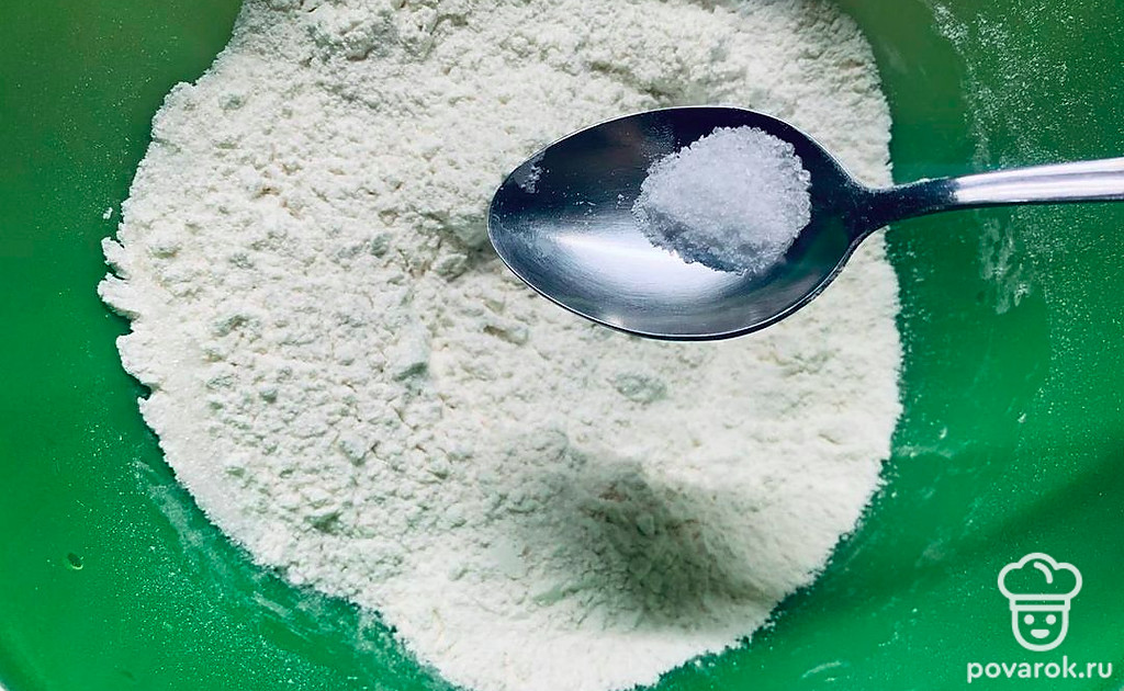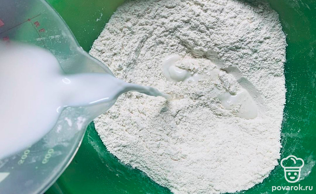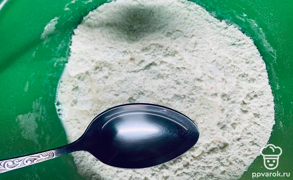 Влейте растительное масло. Начните замешивать тесто сначала ложкой, а потом руками.