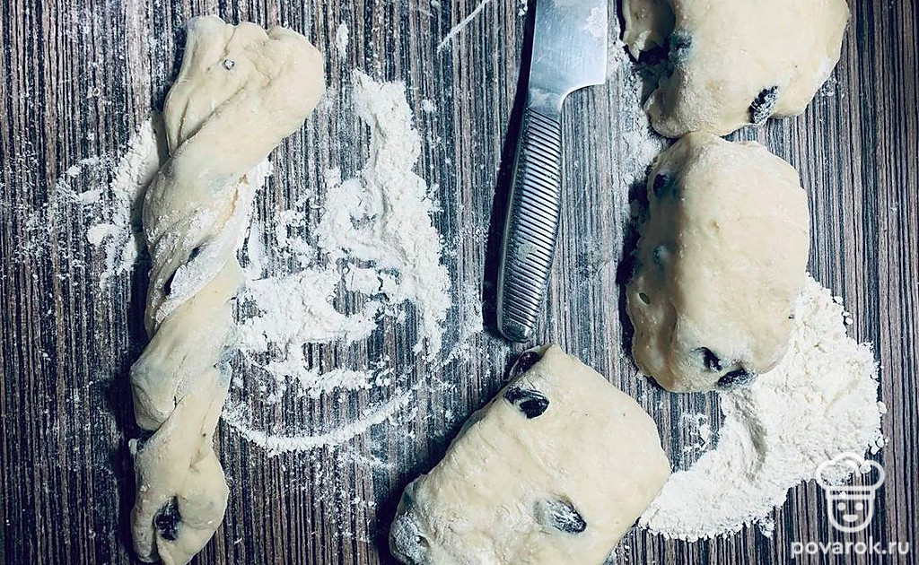 Разрежьте тесто на несколько частей. Скатайте каждый кусочек в трубочку, разрежьте ее пополам и скрутите, как на фото.