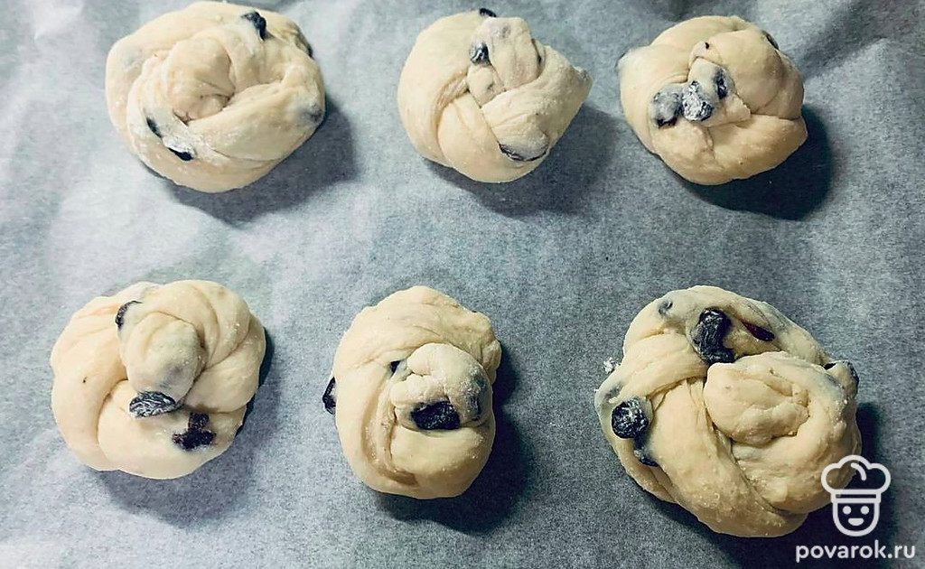 Застелите противень пекарской бумагой. Скрутите булочки, как на фотографии, накройте и дайте постоять 20 минут. Отправляйте запекаться на полчаса в духовку при 160 градусах. Блюдо готово.