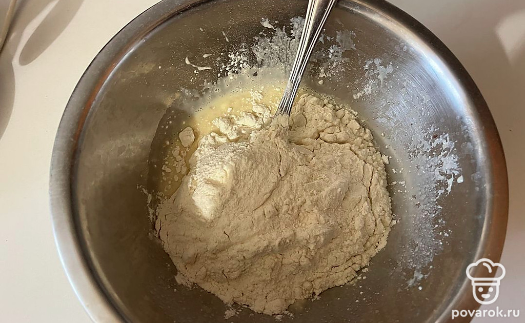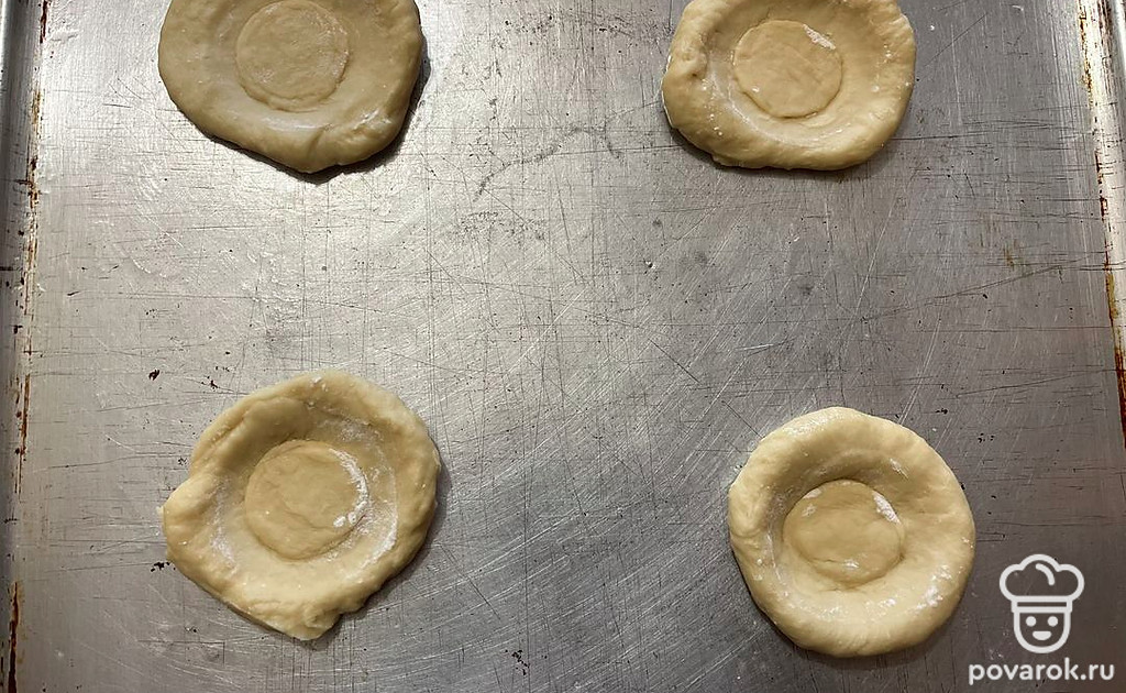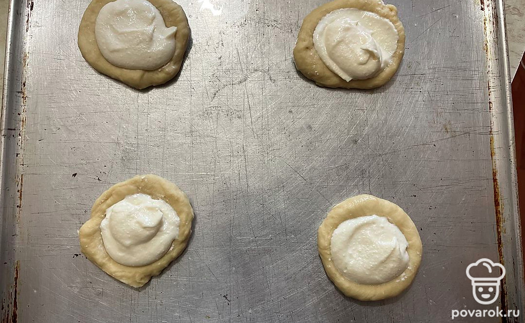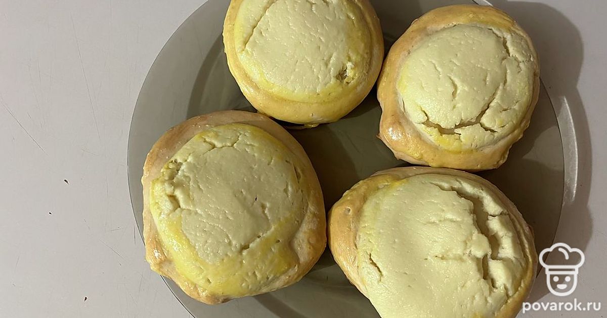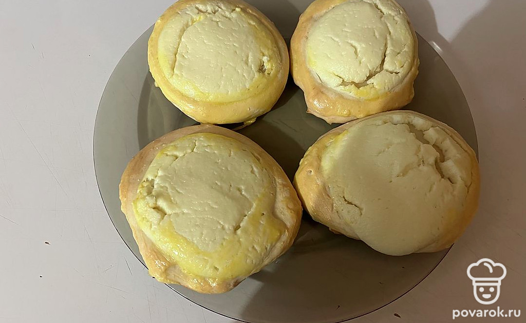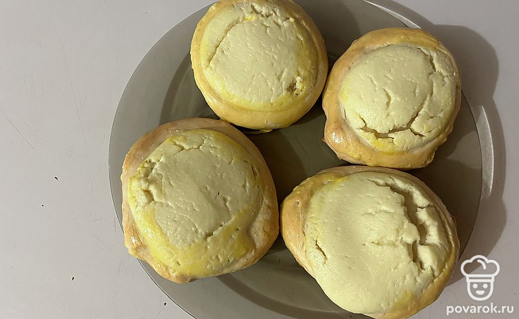 Эту массу распределите по углублениям в тесте. Булочки отправьте выпекаться в духовку при 185 градусах на 20 минут.