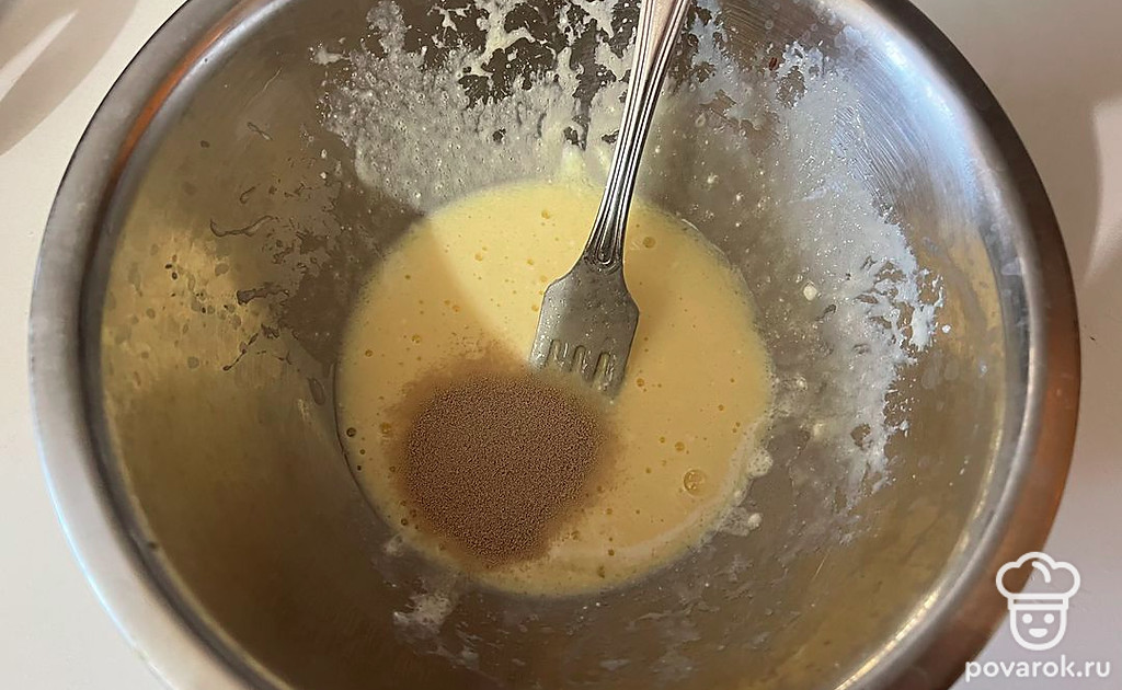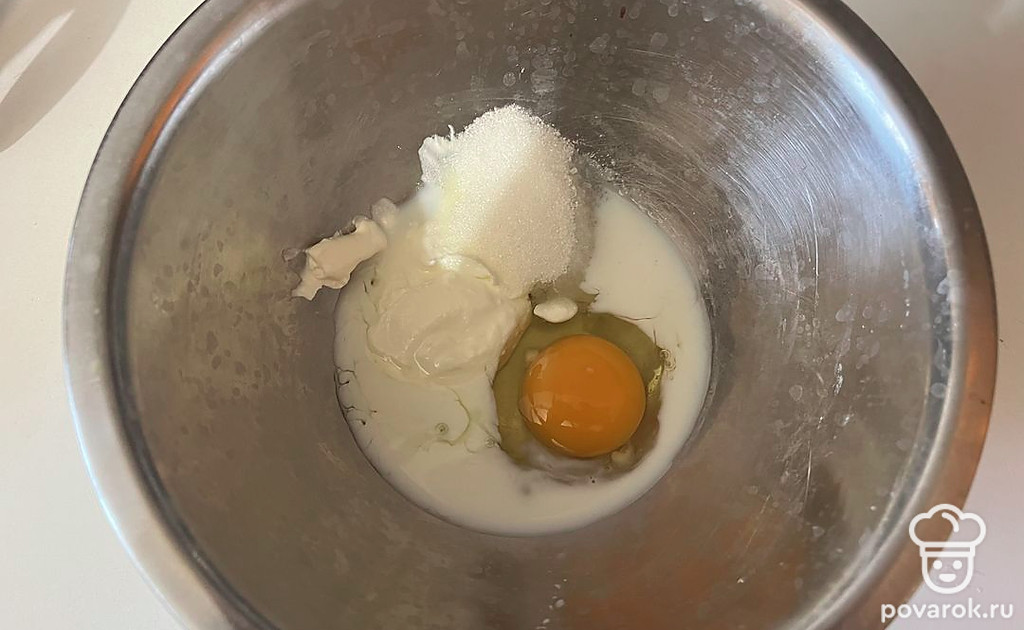 В емкости соедините яйцо, молоко, сметану и 1 столовую ложку сахара.
