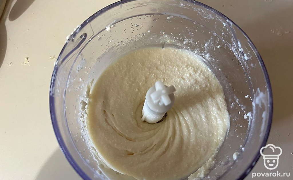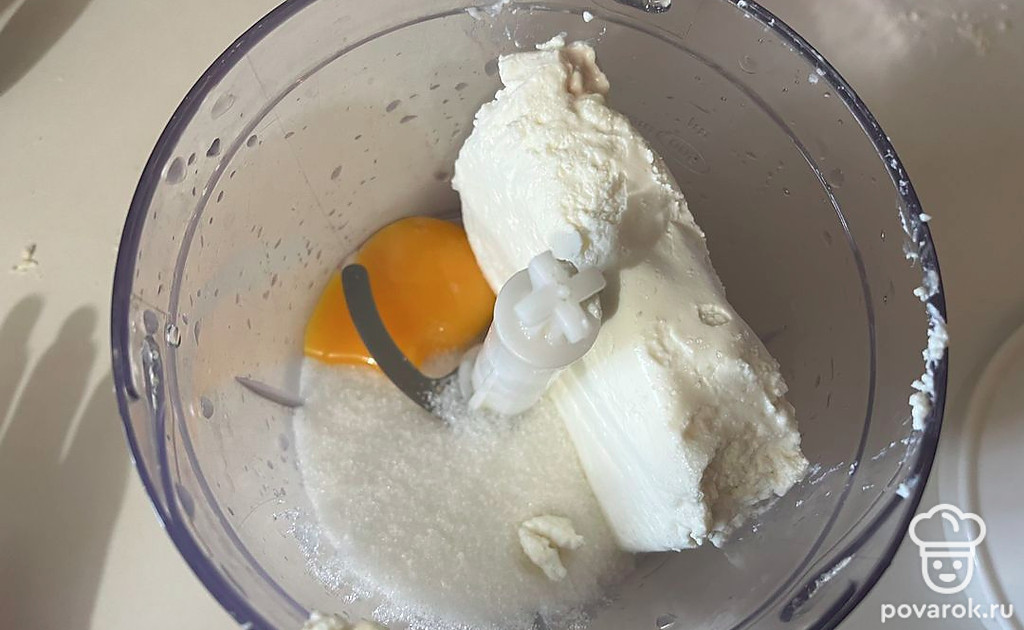 В чаше блендера соедините оставшийся сахар, желток и творог.