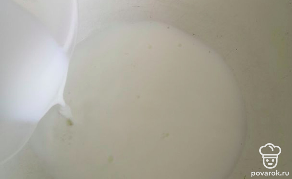 Молоко подогреваем, оно должно быть теплым, не горячим. Выливаем в миску.