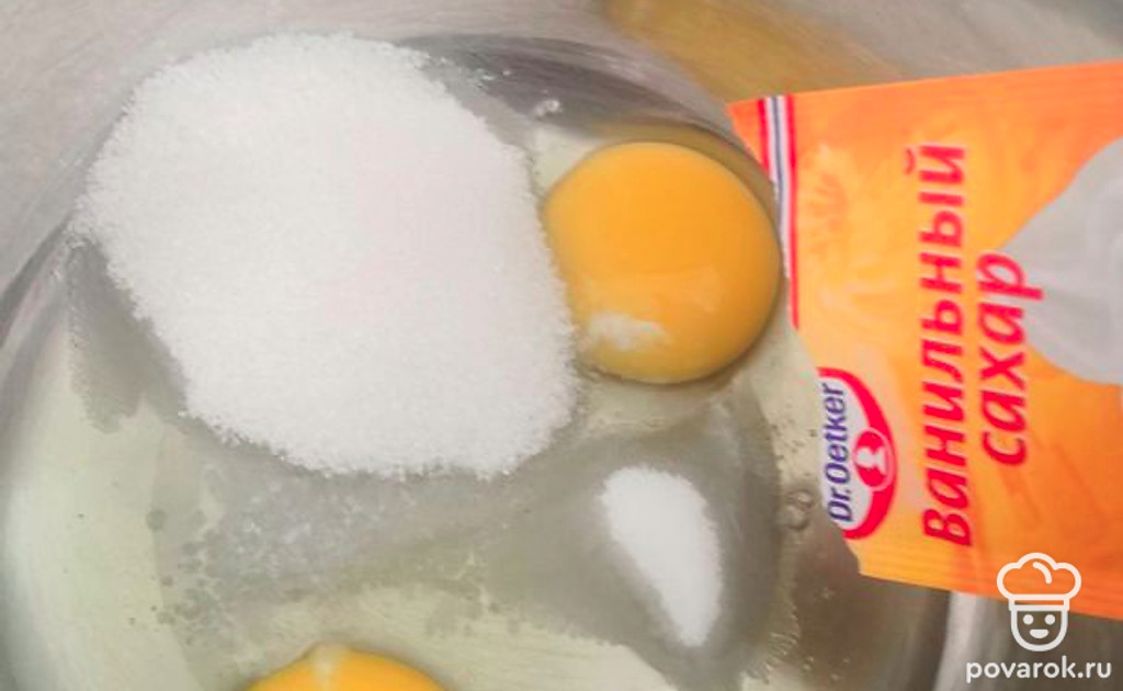 Далее добавляем 60 грамм сахара, пол чайной ложки соли и пакет ванильного сахара. Все взбиваем венчиком.