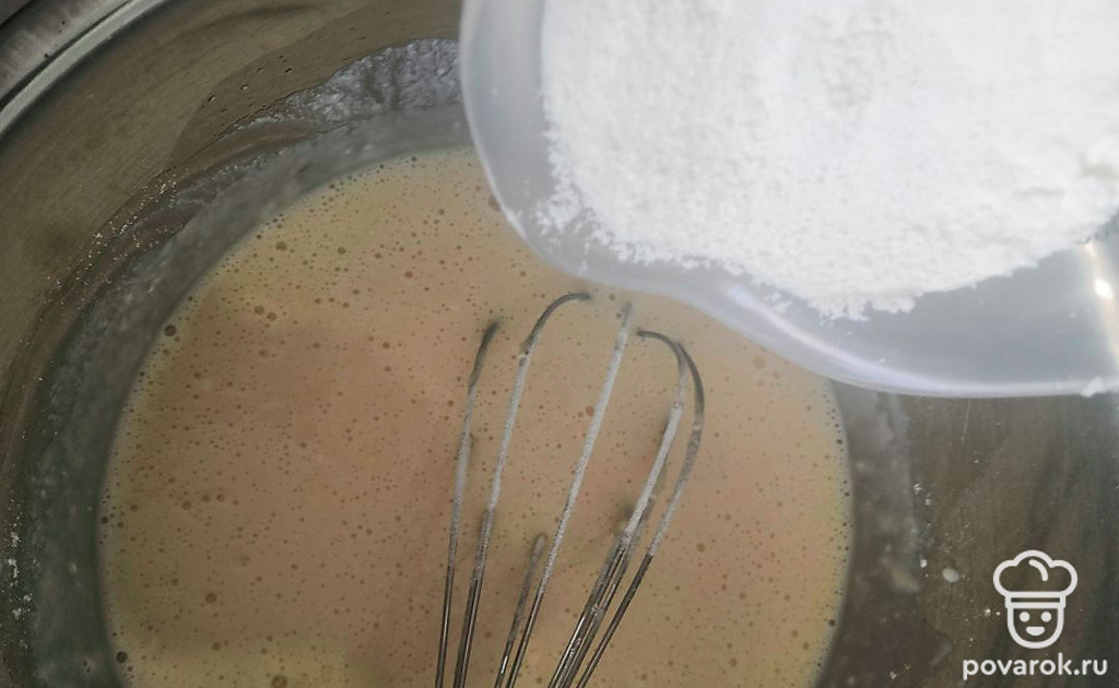 Добавляем к яйцам опару, хорошо перемешиваем.