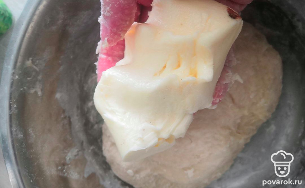 Добавляем к тесту 60 грамм сливочного масла и хорошо вмешиваем его в тесто до однородности.