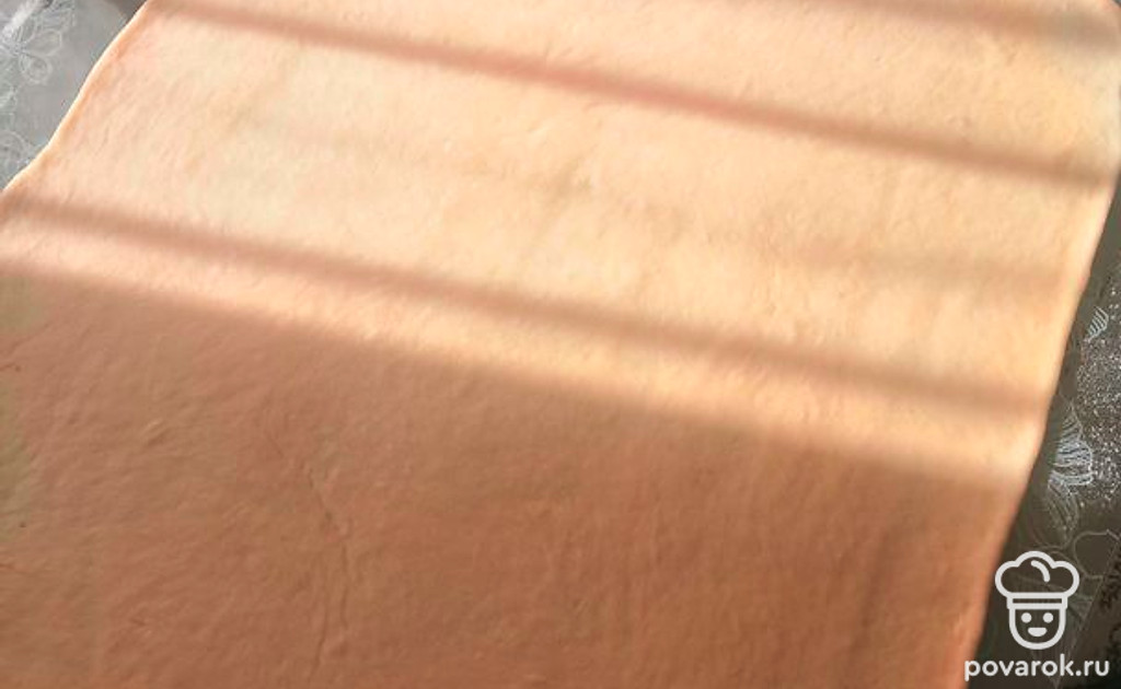 Достаем тесто и раскатываем вот в такой прямоугольник.
