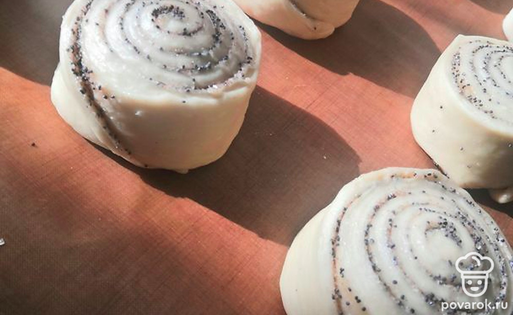 Берём острый нож и нарезаем рулетик на 12 частей. Край подворачиваем под булочку. И ставим на противень на расстоянии друг к другу. Накрываем пищевой плёнкой и даём расстояться минут 40.