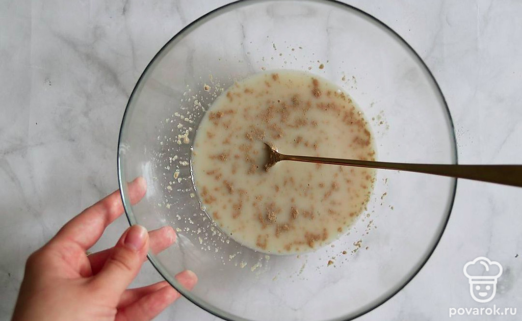 В чаше смешать теплую воду, теплое молоко, сахар и дрожжи. Потставить в теплое место на 15–20 мин.