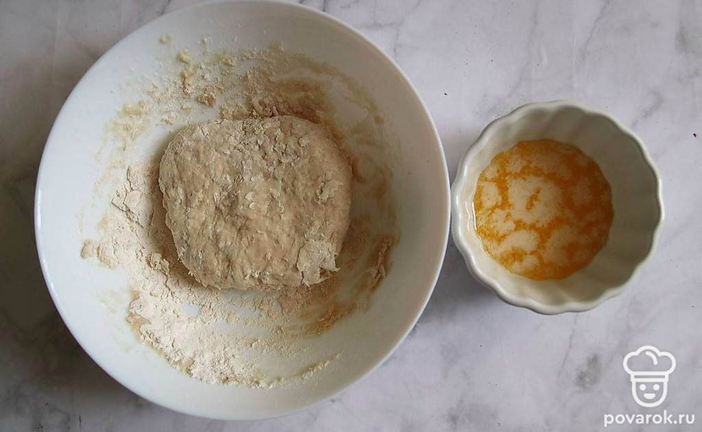 После того как тесто сформировали в шар, добавляем сверху растопленное сливочное масло и еще раз замешиваем — тесто получается неоднородное и рыхлое). Ставим тесто в теплое место на 1 час, оно увеличится в 2 раза.