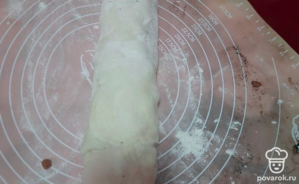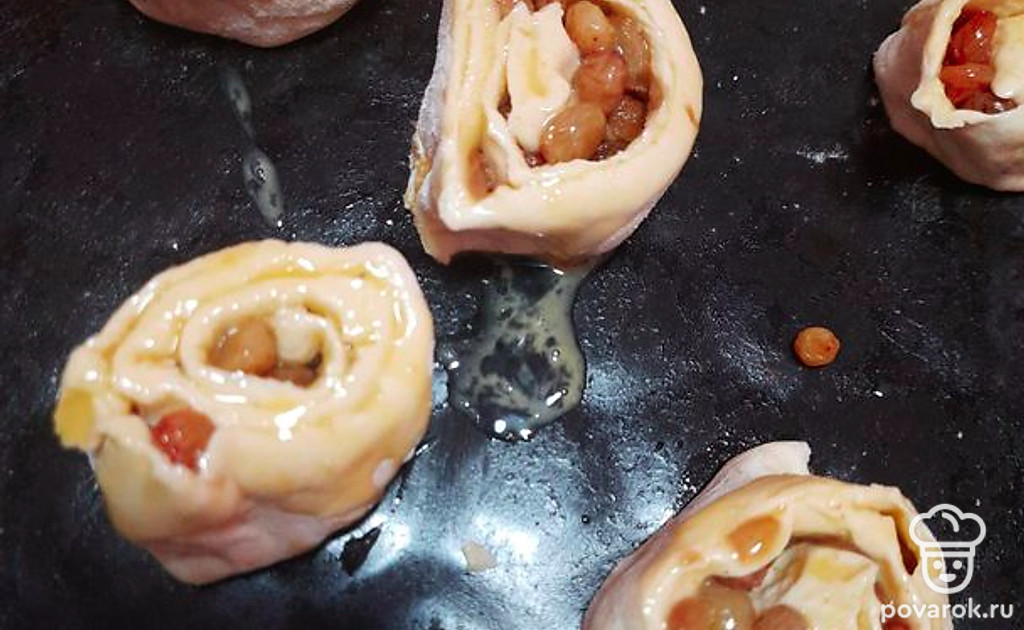Нарезать поперёк на куски шириной 2 см, уложить срезом вверх на противень, смазать яйцом. Отправить в разогретую духовку на 20-25 минут. Готовые булочки смазать сливочным маслом.