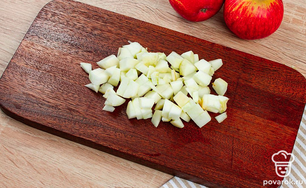 Очищенные яблоки нарежьте небольшими кубиками размером 5-7 мм.