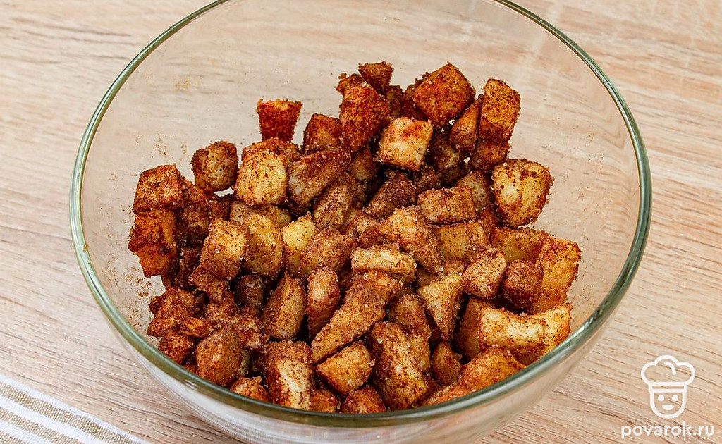 Выложите яблоки в небольшую миску. Добавьте 3 столовые ложки тростникового сахара и 2 столовые ложки молотой корицы. Перемешайте. Начинка готова.