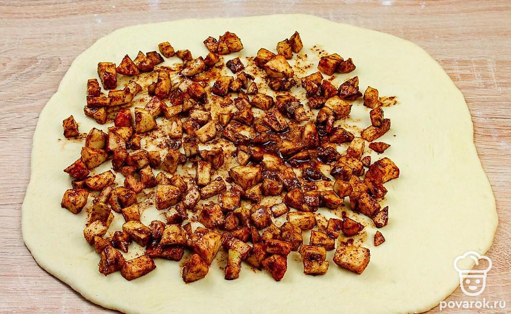 Готовой тесто выложите на присыпанный мукой стол и раскатайте до толщины 5 мм. Выложите на тесто равномерным слоем яблоки с сахаром и корицей.