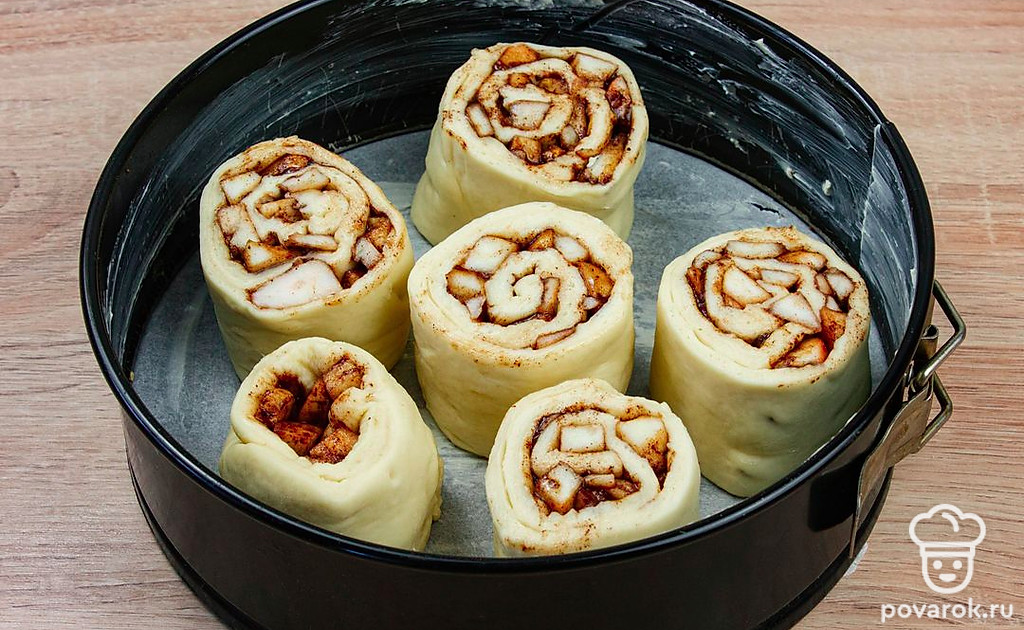 Сверните тесто с начинкой в плотный рулет и разрежьте на 6 частей. Смажьте форму для выпечки сливочным маслом. Выложите в нее получившиеся заготовки. Отправьте синнабоны выпекаться в духовку на 30-40 минут при 180°С.