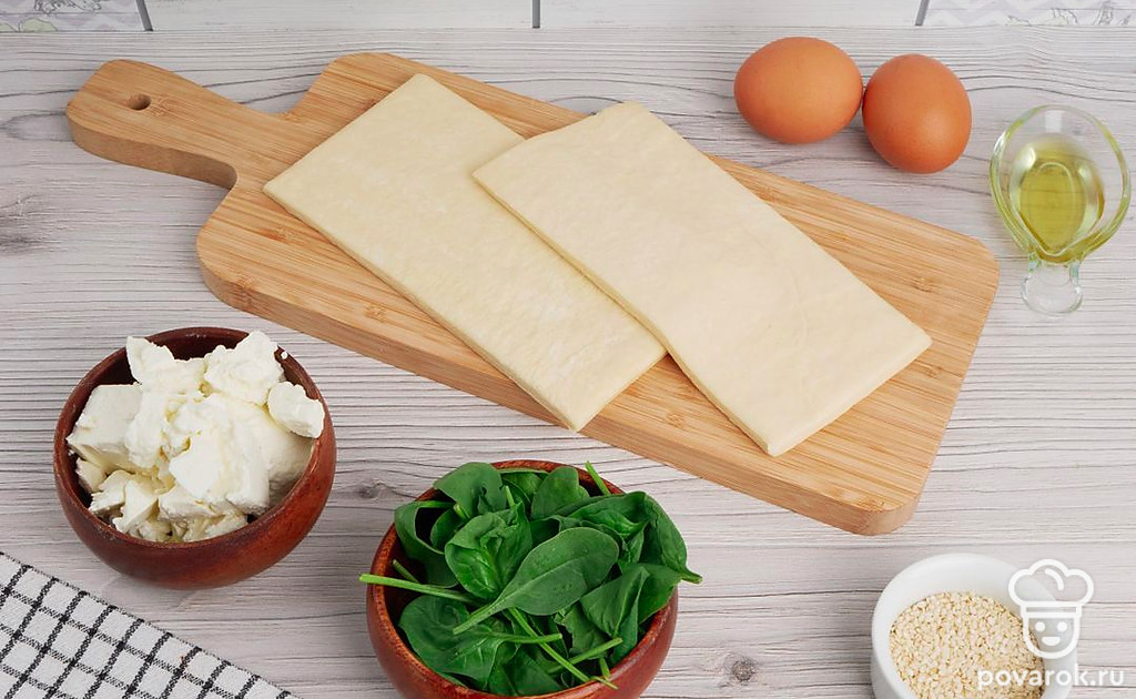 Подготовьте необходимые ингредиенты. Тесто достаньте из холодильника, шпинат помойте и обсушите. Яйца также должны быть комнатной температуры.