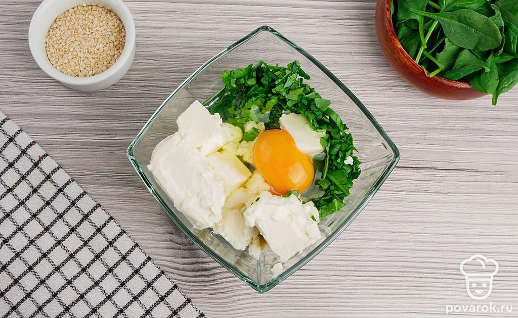 Шпинат мелко порежьте, добавьте в него мягкий сыр и одно яйцо. Все хорошо перемешайте. Начинка готова.