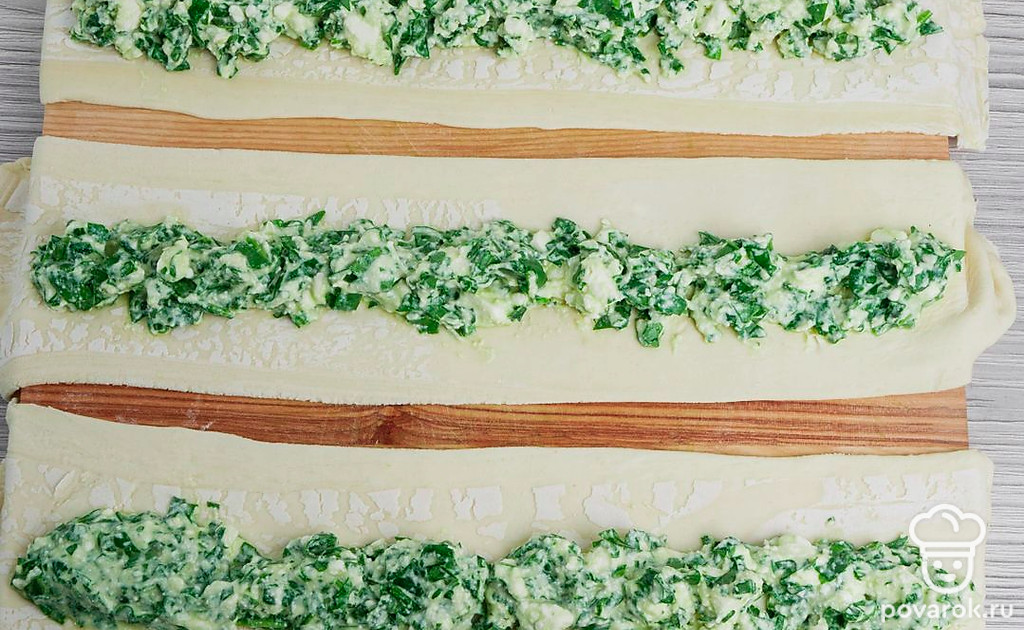 Тесто раскатайте в пласт толщиной в 3 мм. И нарежьте на полоски шириной 6-7 см. На каждую полоску положите начинку. Начинку выкладывайте, оставляя с краев по 2 см.