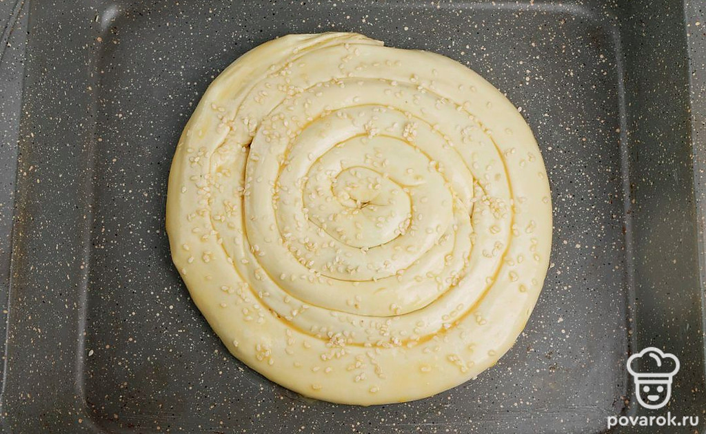 Форму смажьте маслом. Укладывайте колбаску закручивая ее. Одна за другой. Хвостик одной колбаски- это продолжение другой. Плотненько сверните колбаски. Яйцо размешайте вилкой и смажьте сверху улитку. Посыпьте кунжутом.