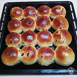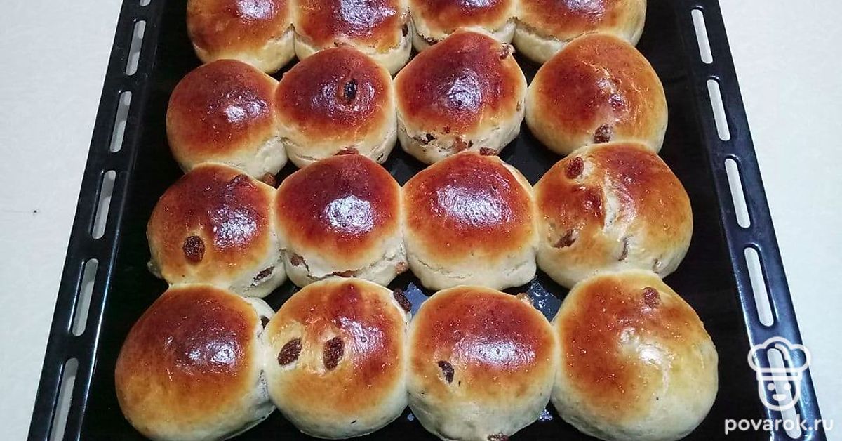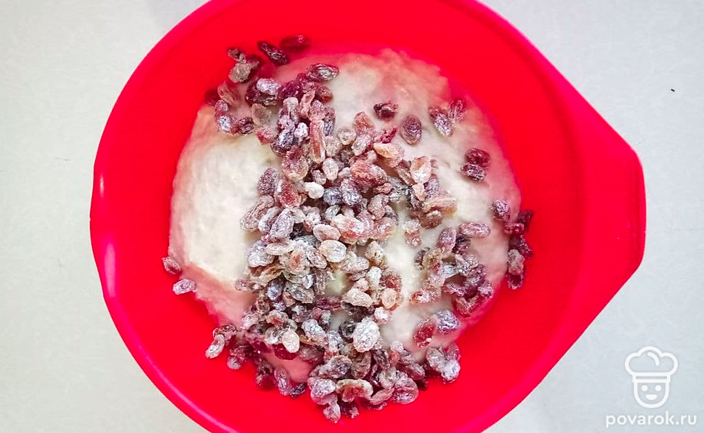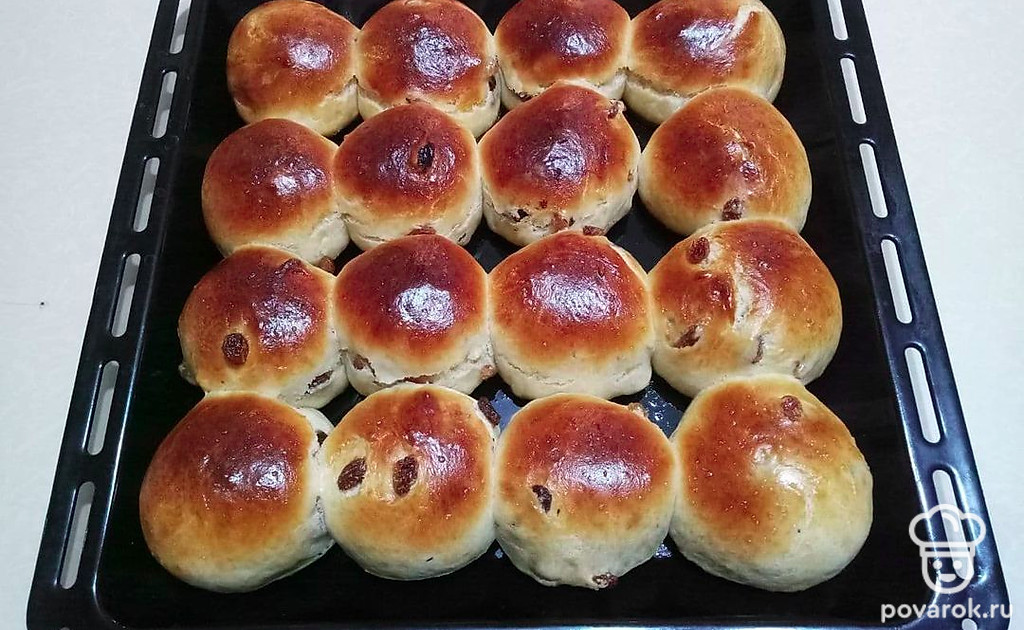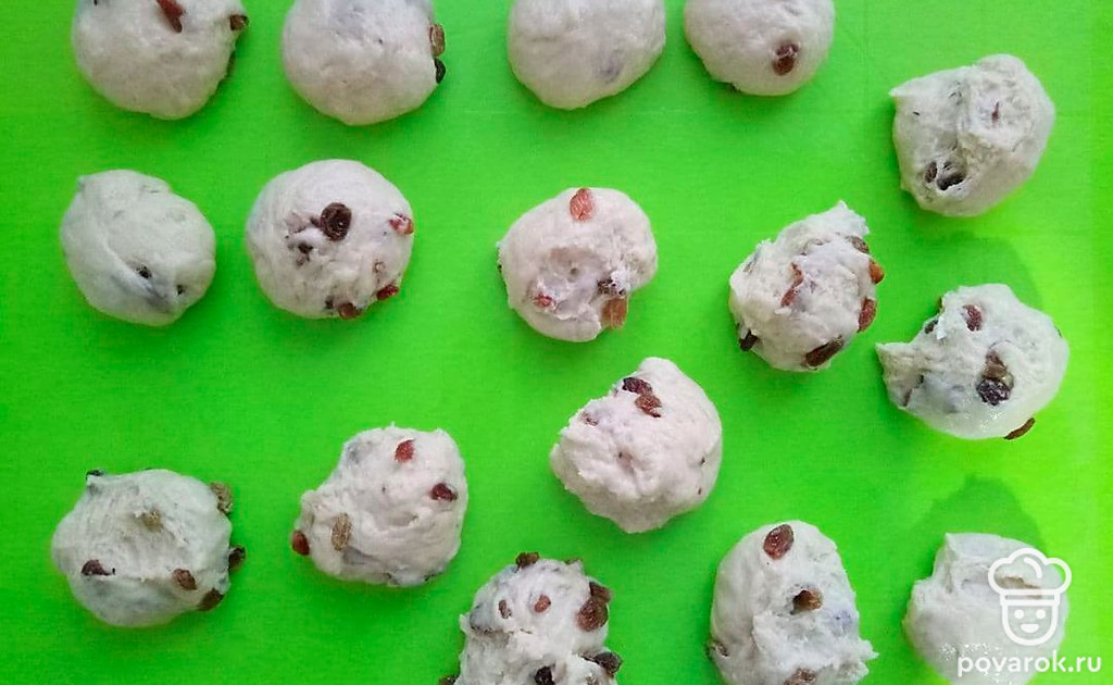 Всыпьте изюм, обомните. Разделайте тесто по размеру булочек и смазанными маслом руками сформируйте из них шарики. Дайте им подойти в течение 25 минут.