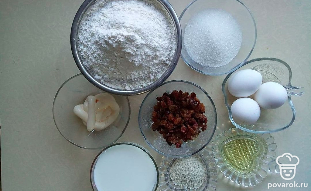 Подержите все продукты из холодильника при комнатной температуре. Муку просейте. Изюм помойте и обсушите.