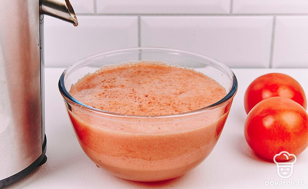 Томатный сок сохраняет все полезные вещества, что есть в помидорах. Томатный сок содержит большое количество каротинов, которые в нашем организме превращаются в витамин А, также практически все витамины группы В, множество минералов и макроэлементов (кальций, сера, йод, калий). На основе домашнего томатного сока можно готовить первые блюда, подливки, мариновать мясо и просто пить в свое удовольствие.