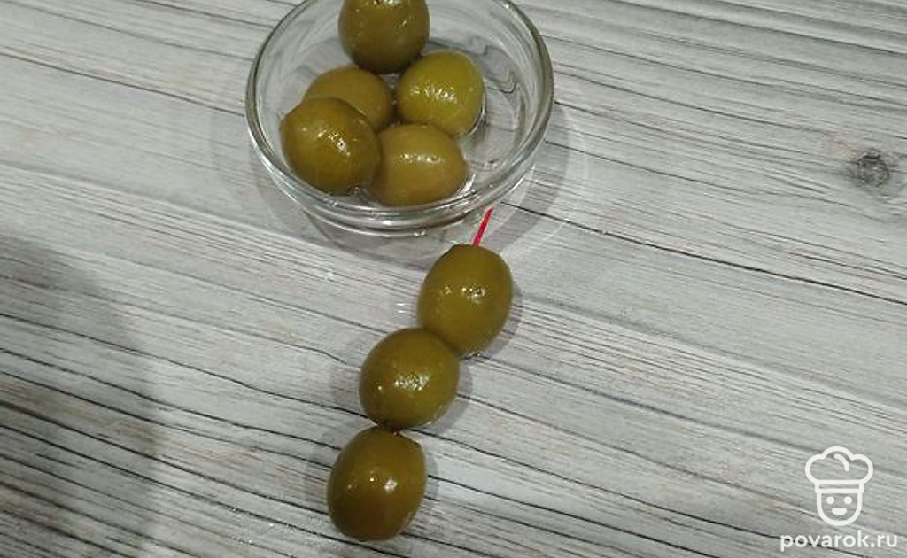 Собираем соломку. Для этого на зубочистку накалываем три оливки.
