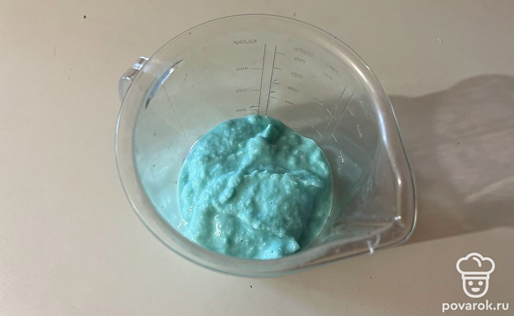 Мороженое, ликер кюрасао и голубой краситель пробейте блендером.
