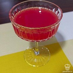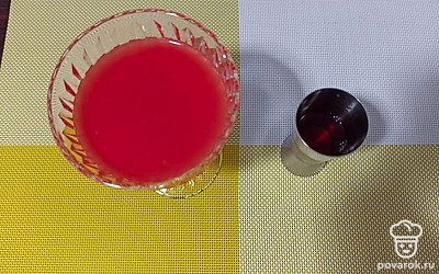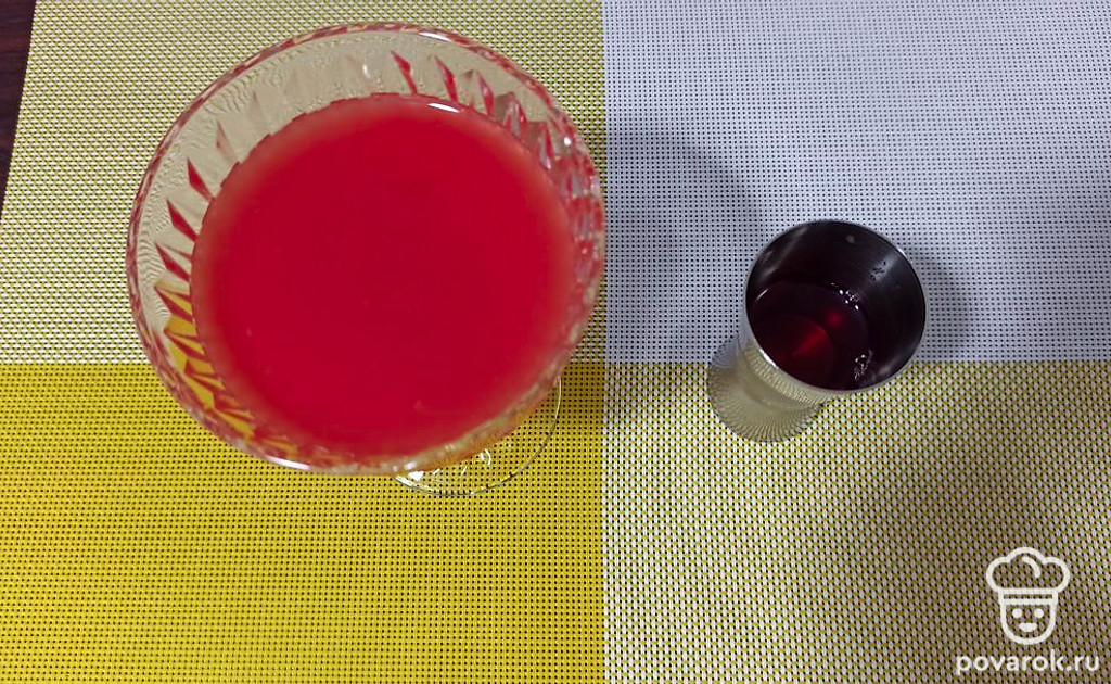 Налейте в мерный стакан клюквенный сироп. Перелейте сироп в стакан с коктейлем и хорошо все перемешайте.