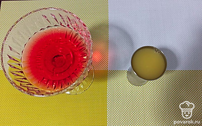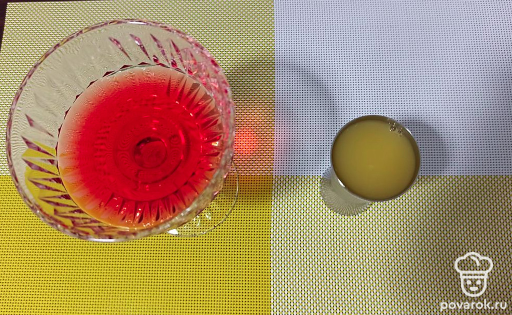 Влейте в мерный стакан апельсиновый сок. Перелейте сок в стакан с аперолем.