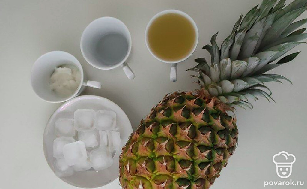Ананас очистите и выжмите сок. Приготовьте лед из морозилки. Выставьте блендер и стакан для готового напитка.