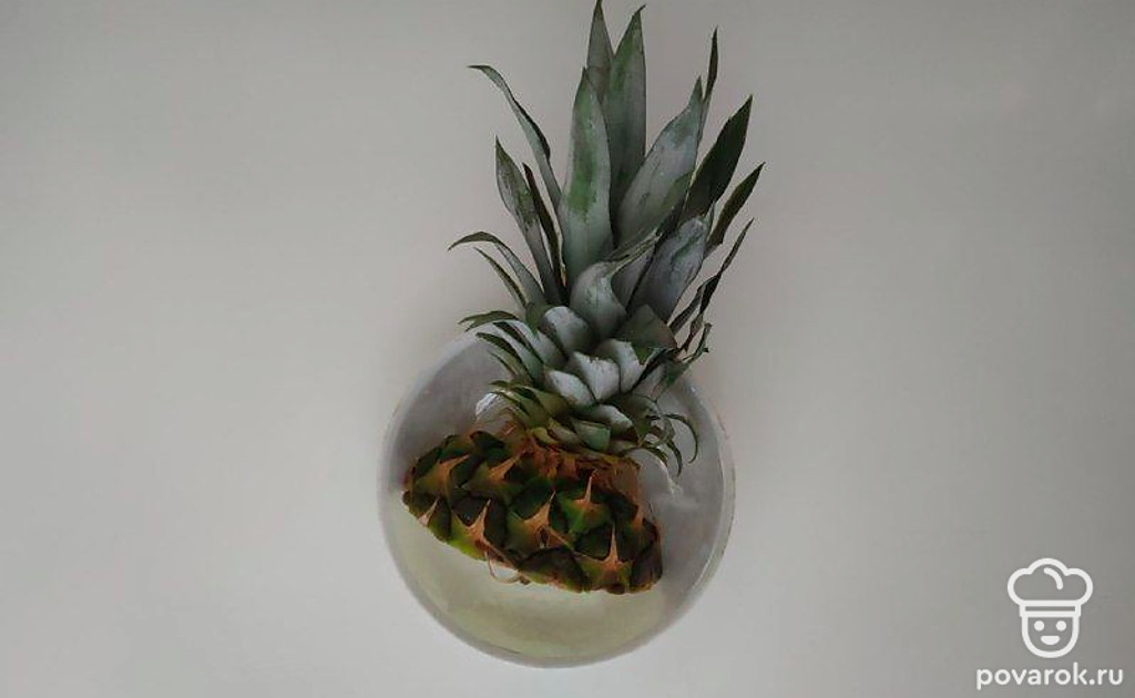 От ананаса аккуратно срежьте хвостик с верхушкой плода. Это пойдет для украшения бокала. С остального ананаса выжмите сок.