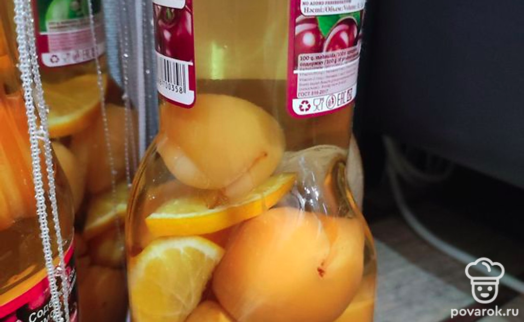 Бутылки простерилизовать. Наполовину заполнить фруктами, залить кипятком. Оставить на 10 минут.