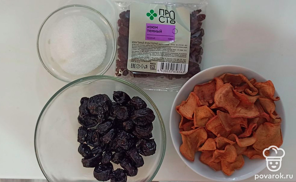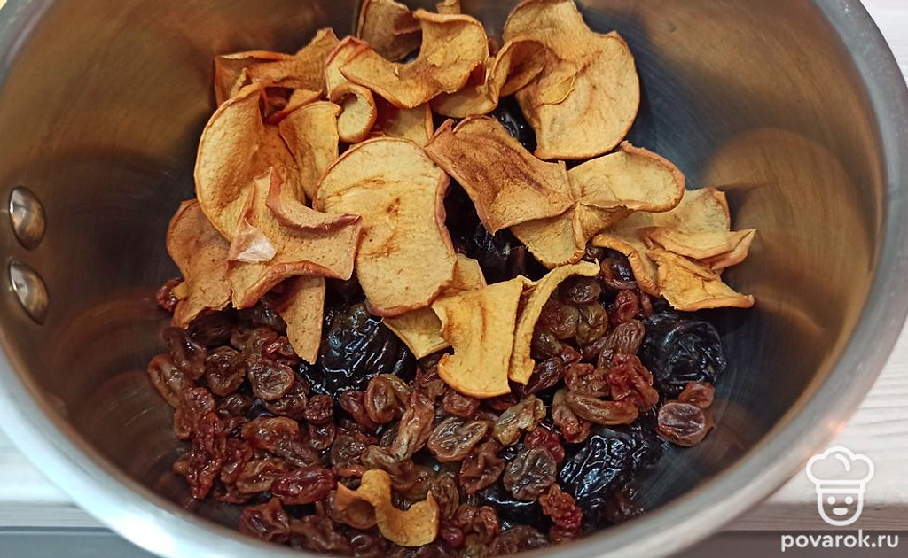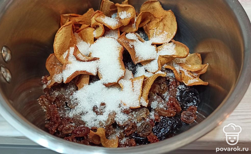 Далее выкладываем в кастрюлю изюм, сушеные яблоки и чернослив.
