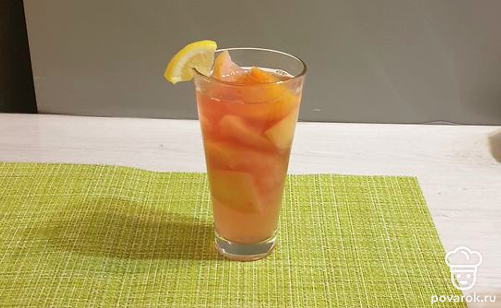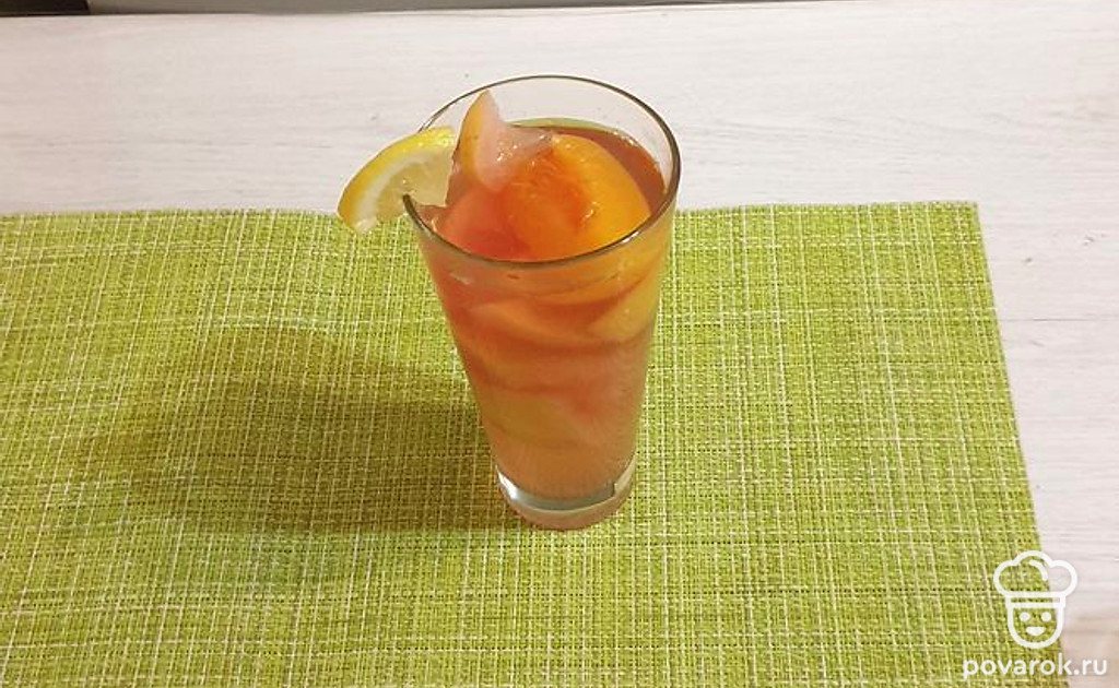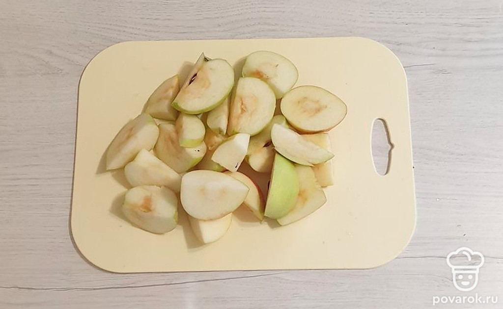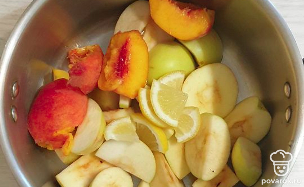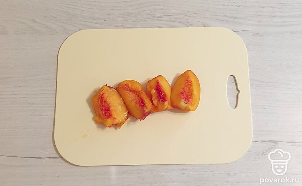 Персик разрежьте пополам. Уберите косточку, нарежьте на дольки.