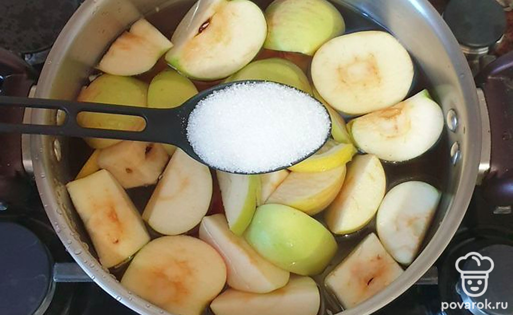 В компот добавьте сахар. Варите до закипания. Огонь сократите и варите еще 10 минут.
