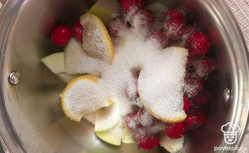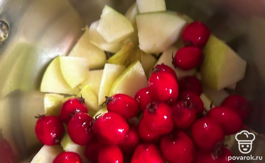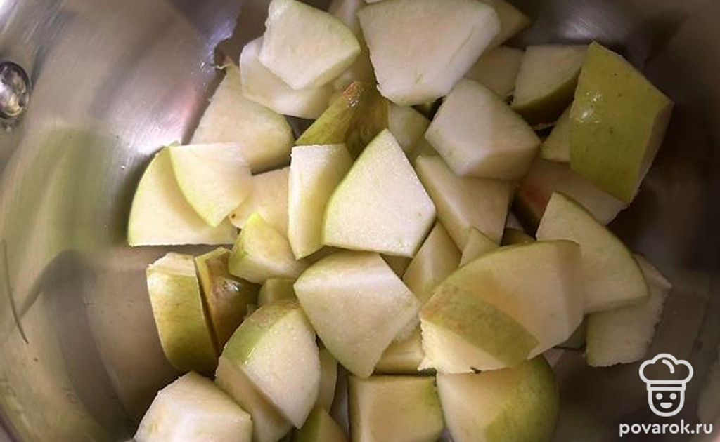 Помыть одно яблоко, нарезать на мелкие кусочки. Добавить в кастрюлю.