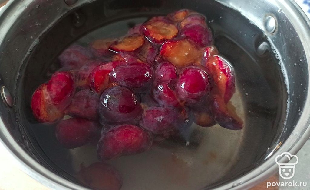 Заливаем сливы водой и ставим на средний огонь. Доводим до кипения и выключаем.