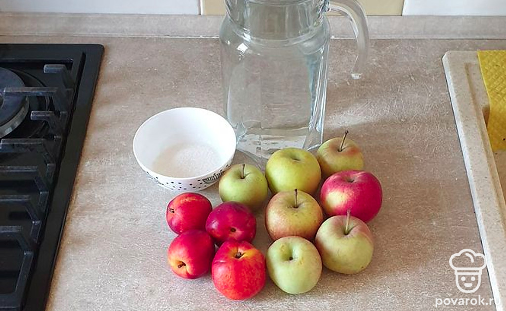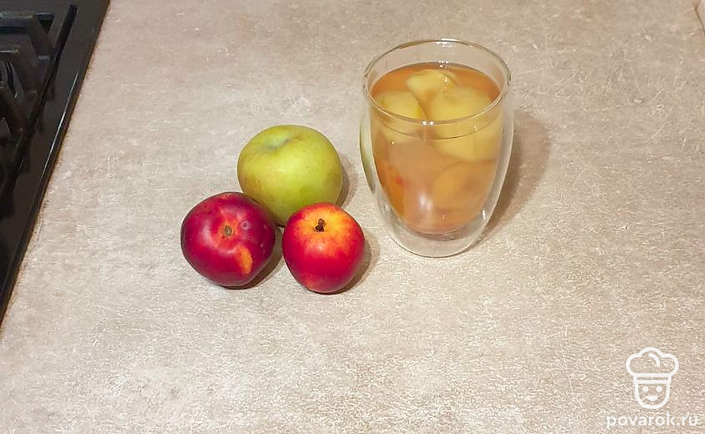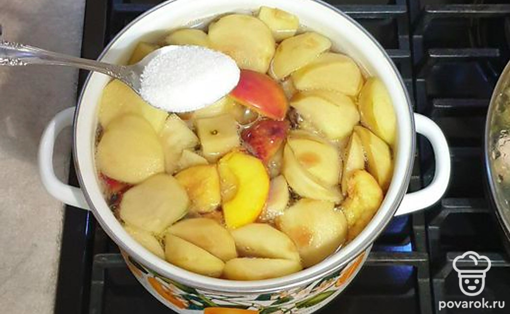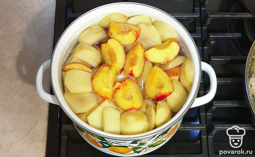 Нектарины помойте, удалите косточку и нарежьте дольками. Опустите нектарины в кастрюлю с компотом и варите еще 10 минут.