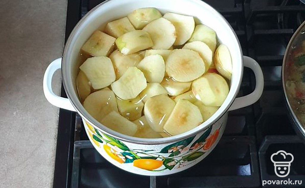 В кастрюлю выложите яблоки и залейте холодной водой. Варите на среднем огне, после закипания около 10 минут.