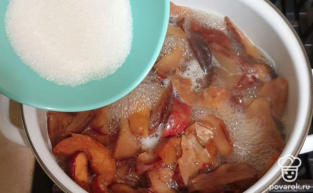 Доведите компот до кипения, после этого добавьте сахар и перемешайте. Варите 20-25 минут.