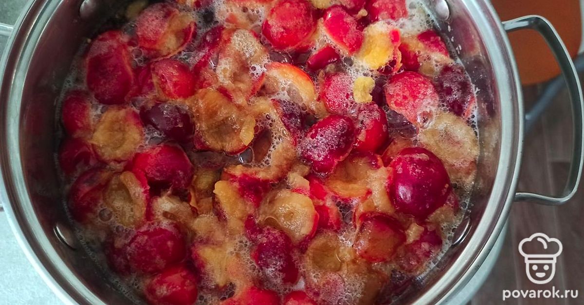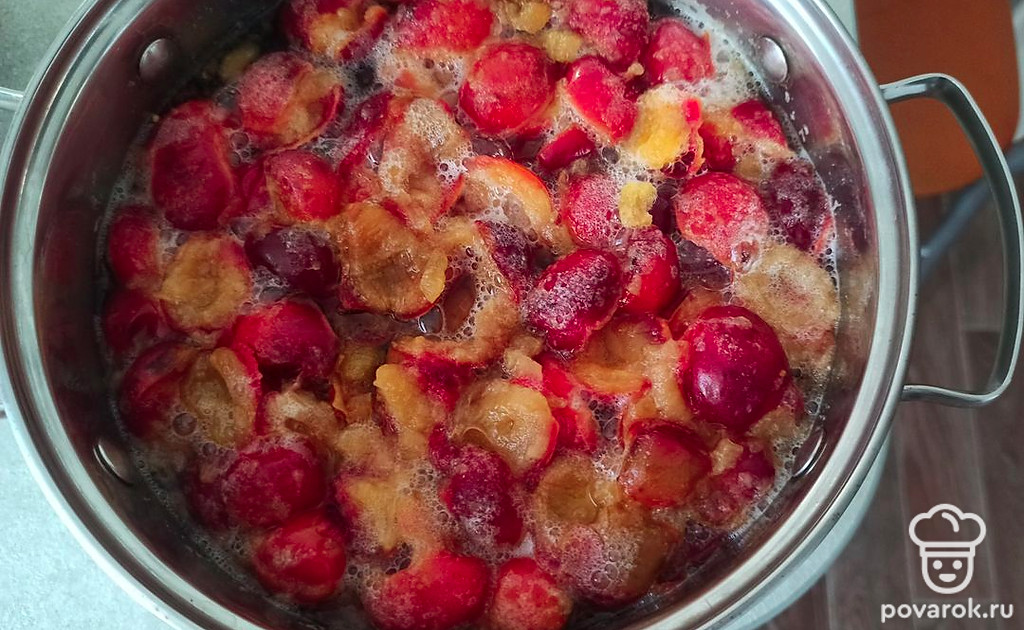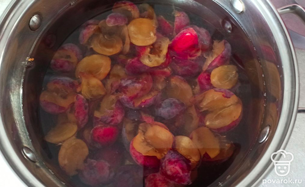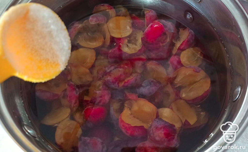 Добавляем с кастрюлю сахар. Ставим кастрюлю на средний огонь. Как только компот закипит, снимаем с огня.