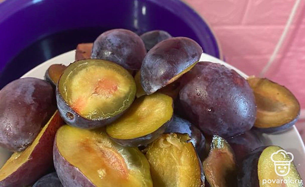 Сливы разрезаем на две части. Когда вода будет кипеть, добавляем сливы.