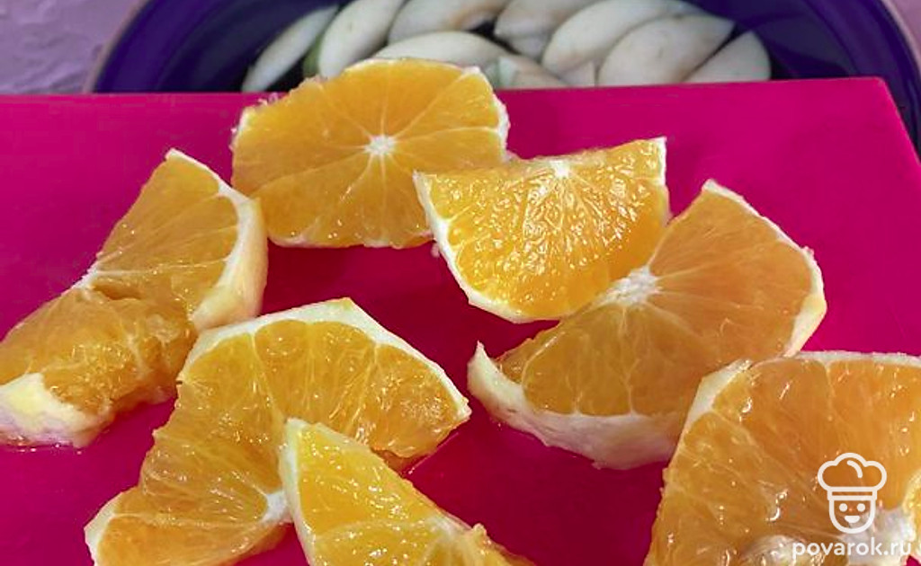 Апельсин очищаем, нарезаем большими кусочками. Добавляем в кастрюлю.