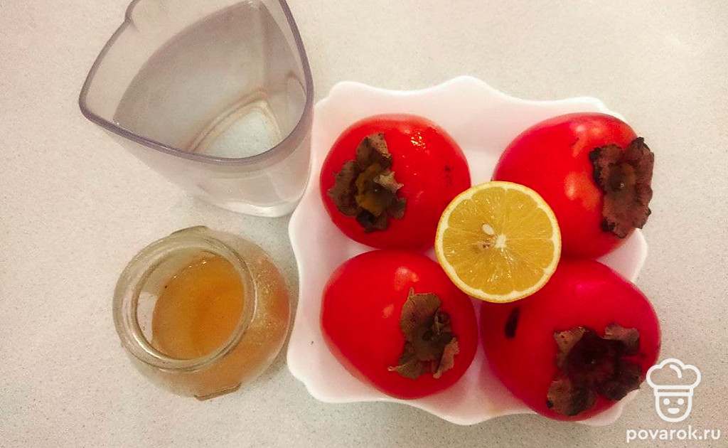 Вымойте хурму и лимон, обсушите их на полотенце. Приготовьте очищенную воду и цветочный мед.