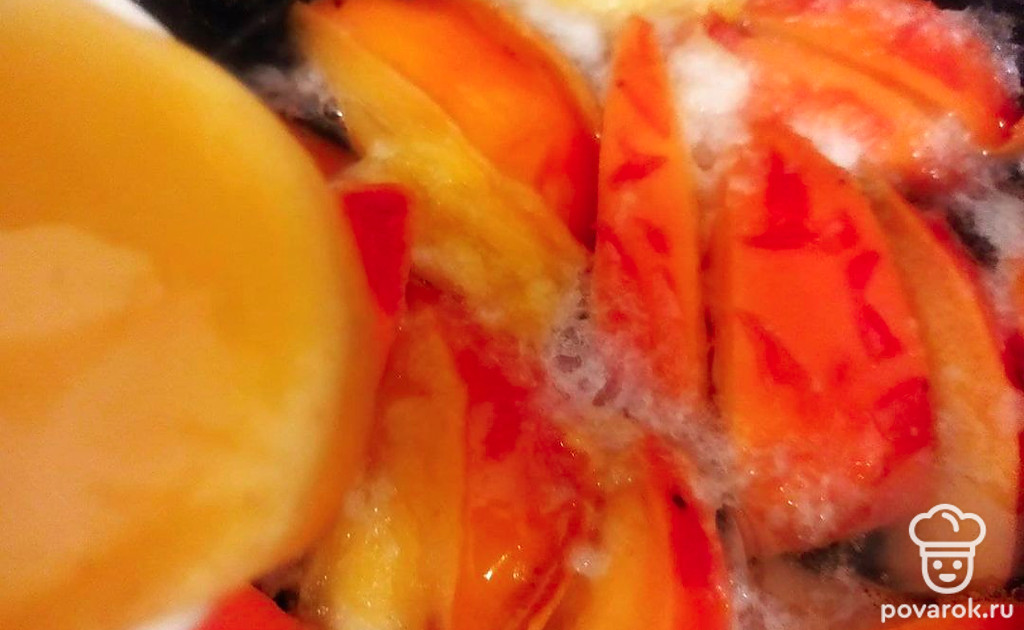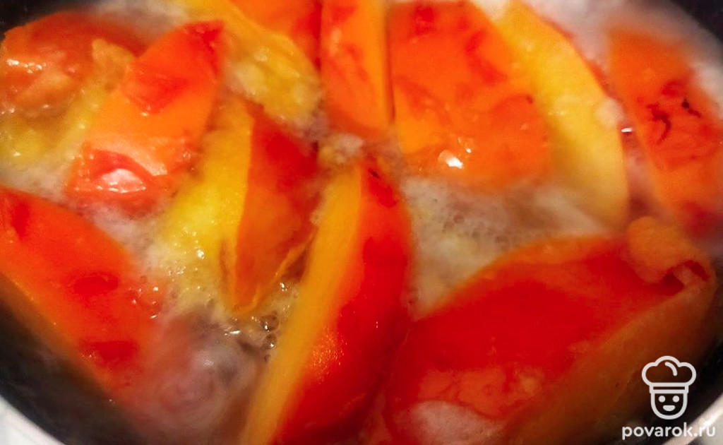 В глубокой кастрюле вскипятите воду и добавьте в нее нарезанную на дольки хурму. Кожицу у хурмы удалять не нужно, достаточно убрать листочки и семена, если они есть. Кладите хурму именно в кипяток, а не холодную воду, чтобы сохранить как можно больше витамин.