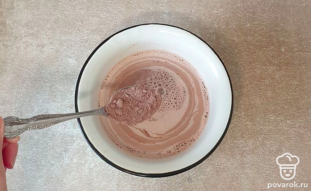 Добавьте какао и сахар, хорошо перемешайте до однородного состояния. Воспользуйтесь венчиком.
