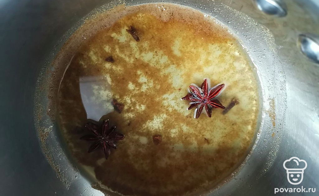 Все пряности залить водой и проварить на слабом огне 5 минут. Дать настояться 10 минут.