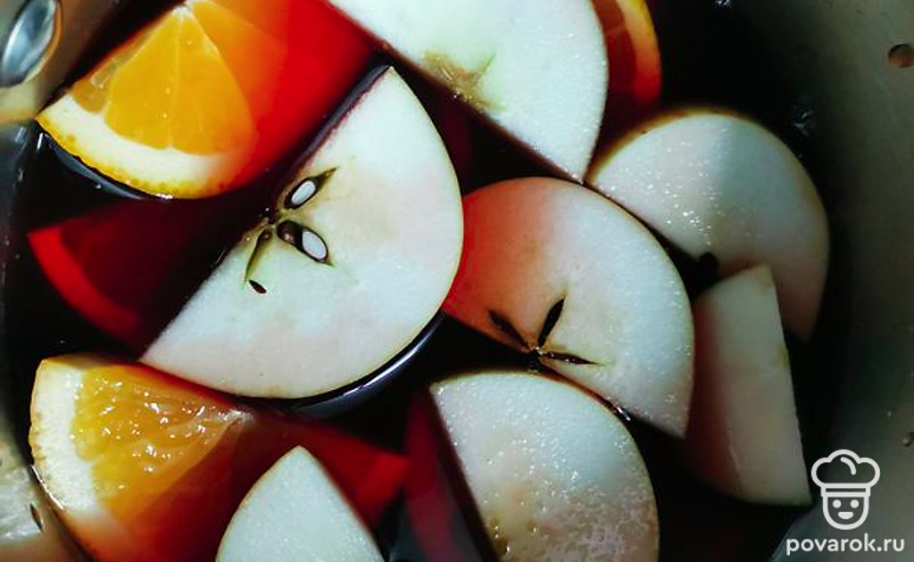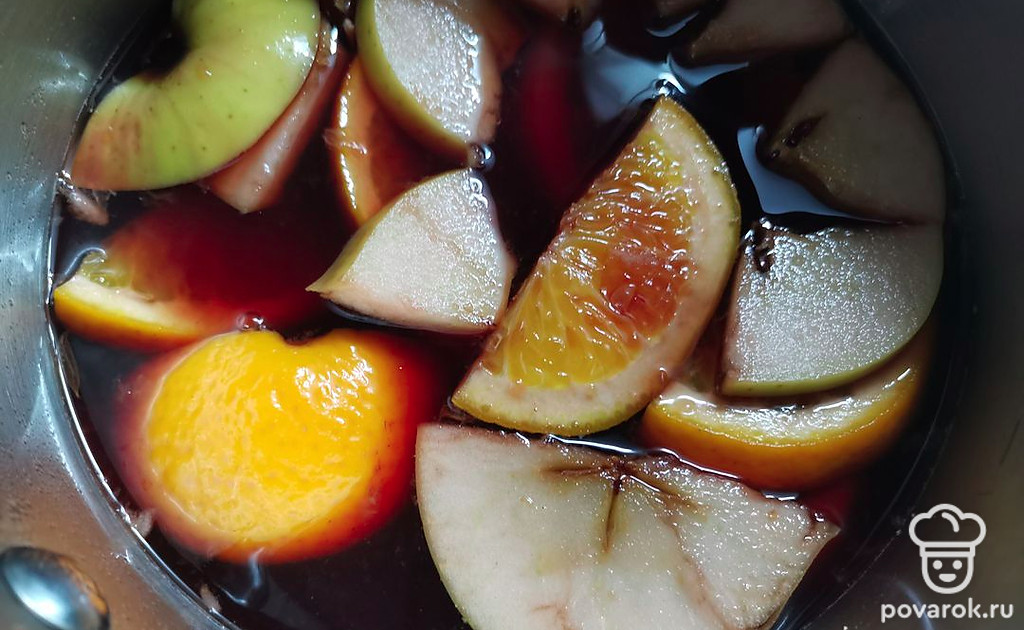 В сотейник процедить отвар, добавить вино и нарезанные фрукты. Я использовал домашнее вино, оно у нас достаточно сладкое. Если вы берете полусухое или сухое вино, то можете добавить сахар.