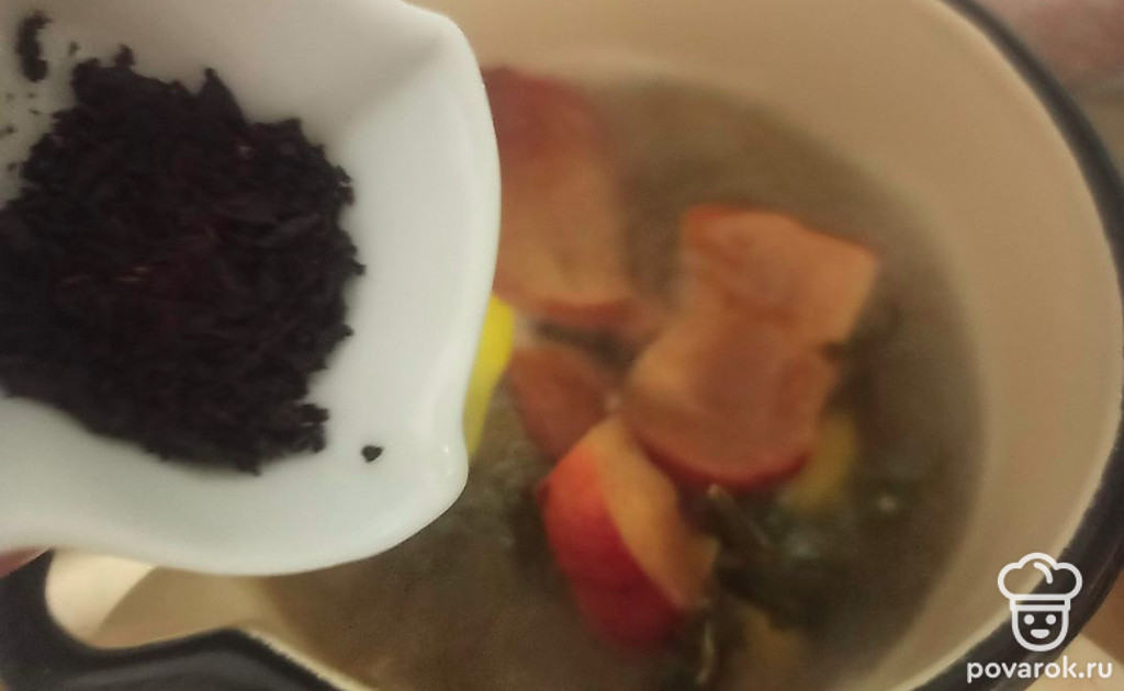 В воду добавьте мяту и кусочки сушеных яблок. Поставьте вариться на среднем огне.